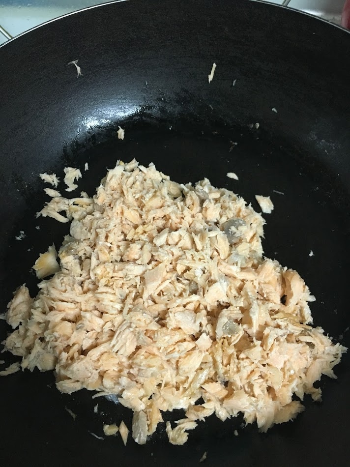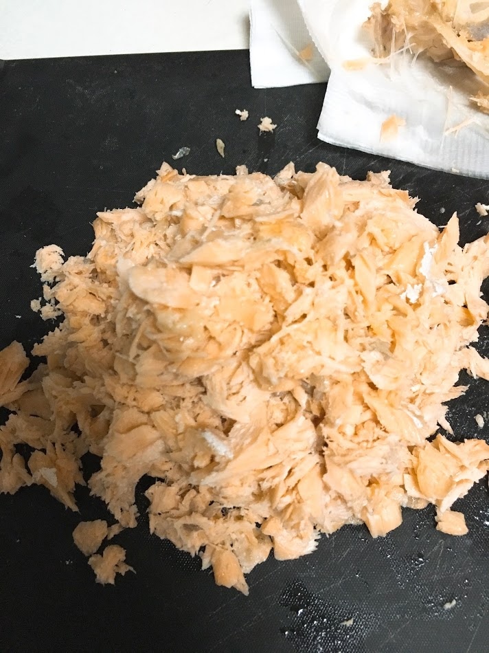 2拿出鮭魚放涼後,把魚肉剝成一小塊(越小越好)這樣才能把小刺也挑掉