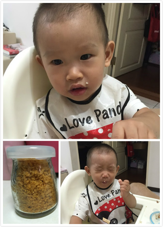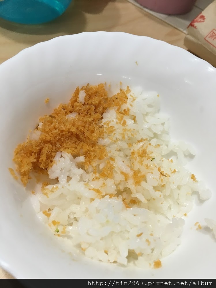 7. OK~大功告成囉,先準備一點給迫不急的寶弟解解纏,也一邊等鮭魚鬆放涼~