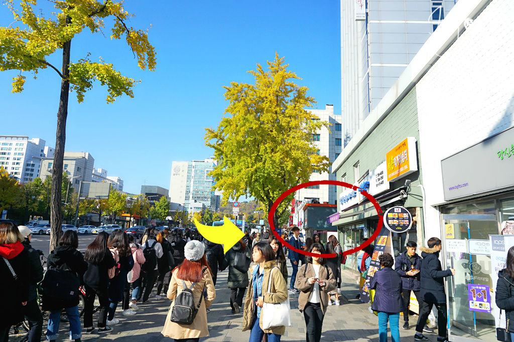 宮女狐궁가는여우就在1號出口走上來白底藍招牌旁邊這棟的6樓(紅色圈圈處),在箭頭指得這裡,一樓門口還有顯眼的立牌