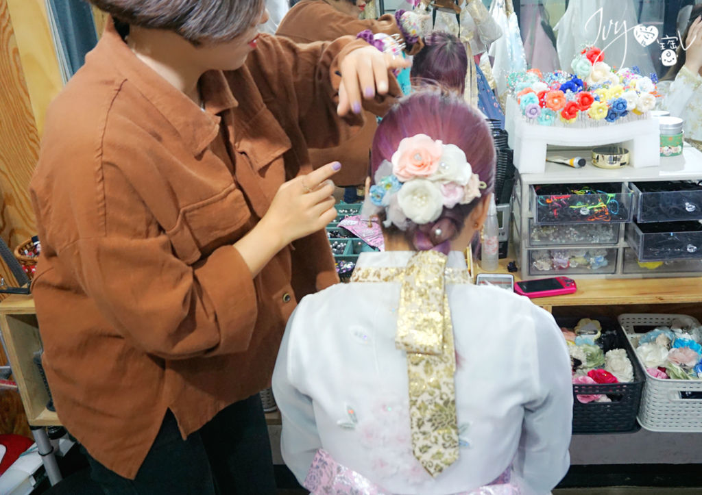 這點要麻煩大家體諒一下哦,歐妮店員們要忙編著一一編髮、協助穿韓服也是很辛苦的,